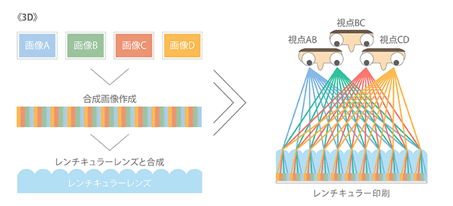 こうして完成した製品は、実際にはアニメーション効果のように絵柄が変化しているだけなのですが、見る人が左右の目それぞれに映る[異なった絵柄]を[同じ絵柄]だと認識してしまう錯覚により「両眼視差」が発生し、3Dに見えるのです。